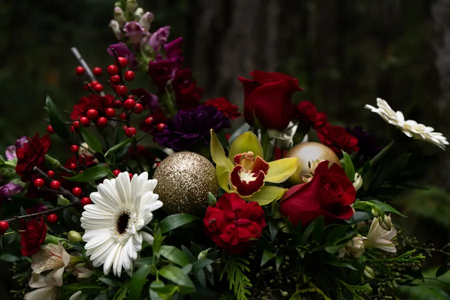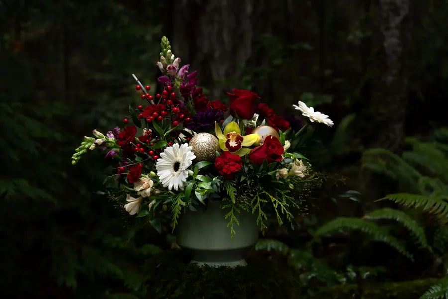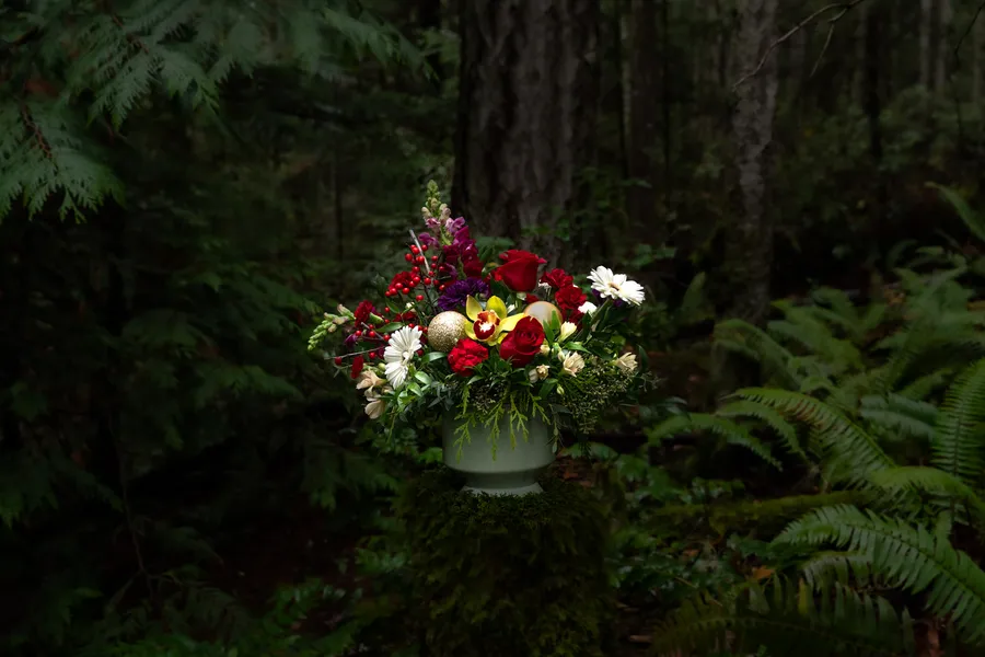 A warm, festive arrangement inspired by the colours and textures of the winter woods. Holiday Forest blends rich reds, soft whites, fresh evergreens, and natural seasonal accents for a lush, classic holiday look.