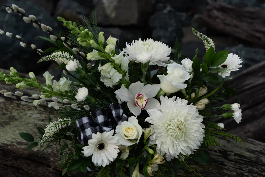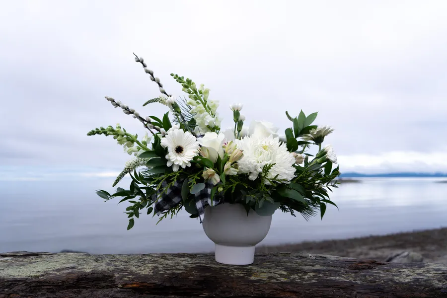 A soft, modern winter arrangement designed with a refined palette of whites and soft natural neutrals. Alpine Whites brings together delicate seasonal blooms and lush greenery for an elegant holiday look.